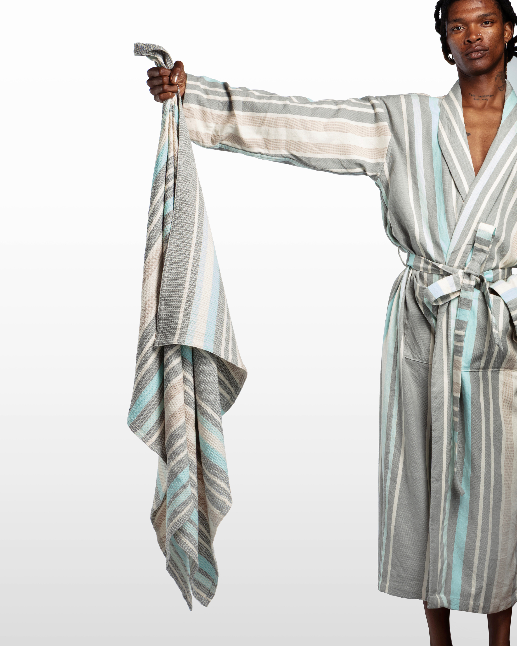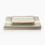 Wrap yourself in the serene beauty of Kenya's skies with our Feruzi Towels. Striped in hues of cream, grey, and electric turquoise, their design captures the tranquil transition of the seasons. Woven in soft, highly absorbent cotton locally sourced from Kenya and Uganda for a touch of everyday luxury.